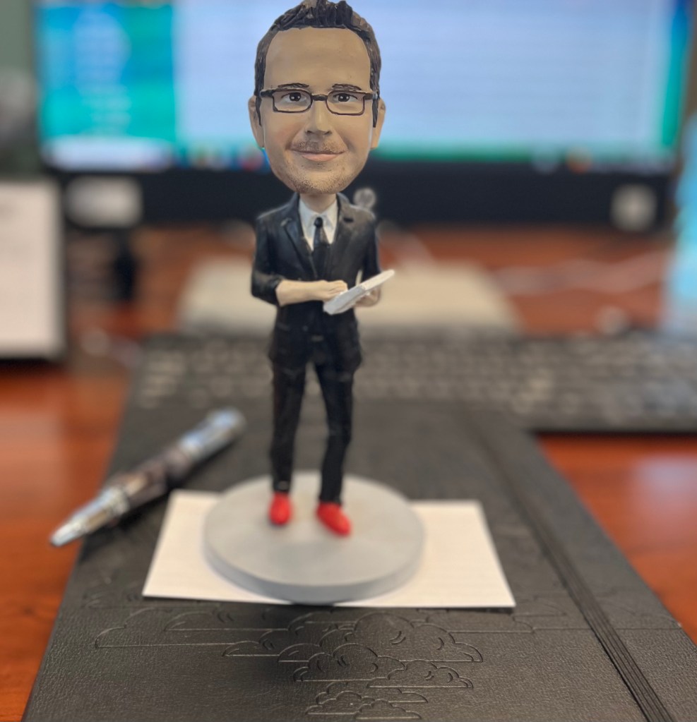 I love wearing sneakers with my suits it is a trend that still hasn’t died for me, but the red shoes did die. I put the red shoes in the recycle bin about 2 years ago. One year at a Hugo Boss holiday party my director approached me and my future wife and mentioned how me wearing sneakers with suits reminded her of the singer Lenny Kravitz. I love Lenny Kravitz! He is so cool, his music and style are amazing. If I had any doubts about wearing athletic shoes with dress clothes they where all washed away by that compliment. Later that year as a gift my wife gave me a bobblehead in my own likeness. I was in a suit and holding my ipad and on my feet.. You guessed it those red trainers!
