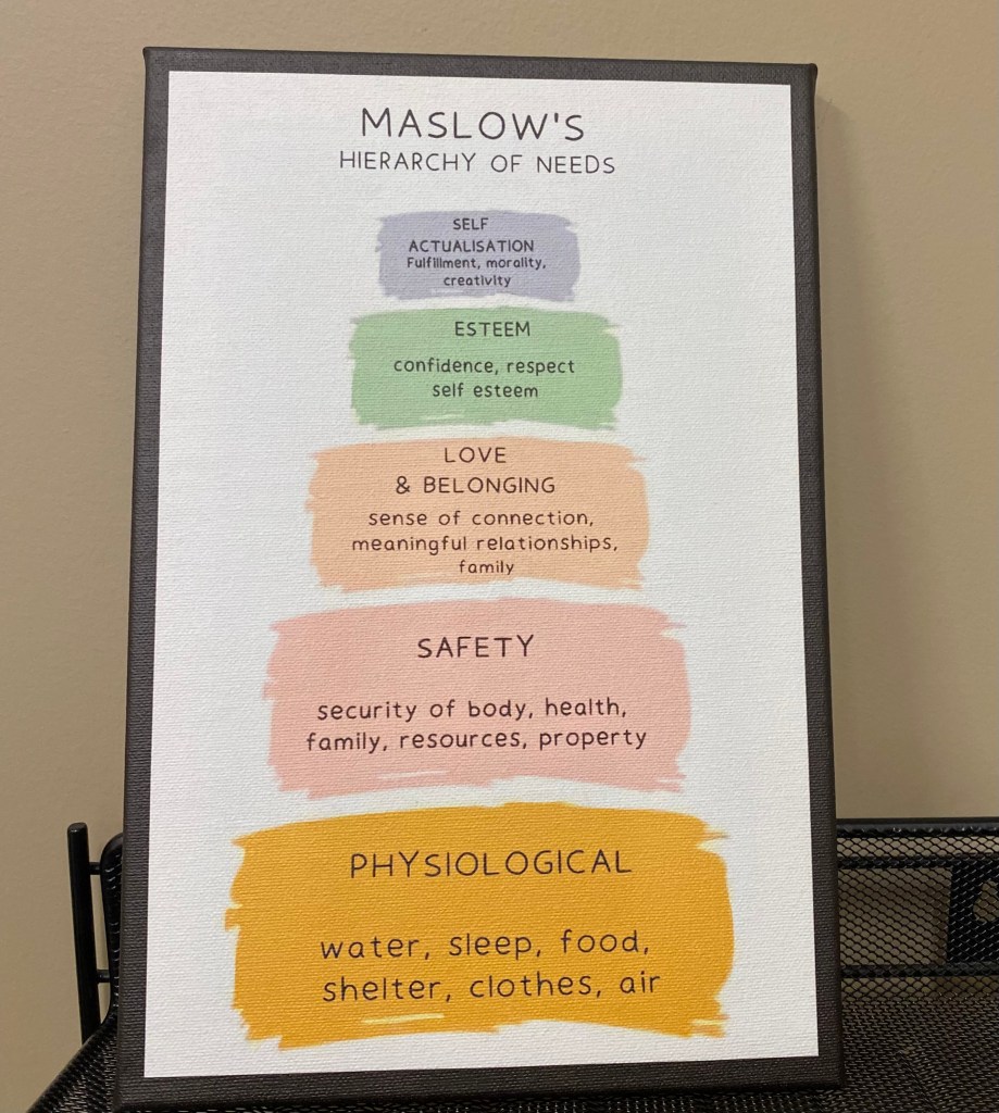 Yesterday I put up a canvas picture in my office. The picture was a painting of a triangle demonstrating Maslow’s hierarchy of needs. If you read previous posts you know that I am a big fan of this hierarchy. It seems that when the needs are meet this truly does make people happy and content.